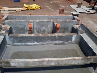 ஐந்து அடி ஆர்ச் அமைத்தால் அதன் மேல், வீட்டின் ஜாக் ஆர்ச் தளத்தின் மழை நீர் அறுவடை தொட்டி அமைப்பது கடினம். அதற்காக அதையும் சமமாக ஆகுமாறு நிரவ வேண்டும். மேலும், ஐந்து அடி ஆர்ச்சின் மையப்பகுதி எப்படியும் ஒரு அடி உயரம் அதிகமாகி விடும். எனவே, மெல்லியதாக (ஒரே ஒரு அங்குலம் தான்) உள்ள கடப்பா கற்களைக் கொண்டு கூரை அமைக்கலாம் என்று முடிவு செய்தோம். கடப்பா கற்களை வைத்து அதன் இடையில் உள்ள சந்துகளுக்கு சாதாரண சிமெண்ட் கலவை வைத்து அடைத்தோம். பின்னர், அதன் மேல் எட்டு மில்லி மீட்டர் கம்பிகளை குறுக்கும் நெடுக்குமாக அரை அடி தூரத்தில் வைத்து கட்டி அதன் மேல் கோழி வலையை பரப்பி சிமெண்ட், மணல் மற்றும் கருங்கல் சிப்ஸ் பொட்ட கலவையால் நிரப்பினோம். அதன் மேல் சிமெண்ட் கொண்டு தரை போல் வழவழப்பாக ஆக்கினோம். மொத்தமாக, இந்த கூரையின் உயரம் நான்கு அங்குலத்தை தாண்டவில்லை. அதனால் மேல் கூரையை விட சுமார் ஒன்றரை அடி கீழேயே இந்த தரை அமைந்தது. இந்த உயர வித்தியாசத்தை பயன்படுத்தி ஜாக் ஆர்ச் கூரையின் பரப்பின் மேல் விழும் தண்ணீர் எல்லாவற்றையும் வழவழப்பான தரையின் மேல் ஒரு தொட்டி அமைத்து அறுவடை செய்கிறோம். தண்ணீர் தொட்டியின் வாட்டம் மூன்று அங்குலம் வைத்ததால் குளியலறை, கழிவறையின் மேல் ஒன்றேகால் அடி உயரத்திற்கு தொட்டி அமைந்துள்ளது. இந்த தொட்டி மூன்று பாகங்களைக் கொண்டது. முதலில், வடிகட்டும் சிறு தொட்டி. இதில், மாடியில் சேரும் மழை நீர் அனைத்தும் வந்து முதலில் விழும். இதில், ஒன்றரை ஜல்லி, முக்கால் ஜல்லி மற்றும் கருங்கல் சிப்ஸ் ஆகியவற்றை ஒன்றன் மீது ஒன்றாக கொட்டி வைத்துள்ளோம். தண்ணீர் இதன் வழியாக சென்று மற்றுமொரு சிறு தொட்டிக்கு, வடிகட்டும் தொட்டியின் அடிவழியாக வரும். அந்த தொட்டியின் மேல் மட்டம் வழியாக மூன்றாவது பெரிய தொட்டிக்கு தண்ணீர் வழிந்து போகுமாறு அமைத்துள்ளோம். இதனால், மண், இலை, குப்பைகள் இல்லாத தண்ணீர் பெரிய தொட்டியில் சேருகிறது. பெரிய தொட்டியின் கொள்ளளவு சுமார் 3500 லிட்டர். நல்ல மழை பெய்தால் சுமார் அரை மணி நேரத்தில் தொட்டி நிறைந்து விடுகிறது. எட்டரை அடி உயரத்திலேயே தண்ணீர் சேமிக்கப்படுவதால் சமையலறை, குளியலறை மற்றும் கழிவறைக்கு குழாய் மூலம் தண்ணீர் புவியீர்ப்பு விசையின் மூலமாகவே கிடைத்து விடும்.