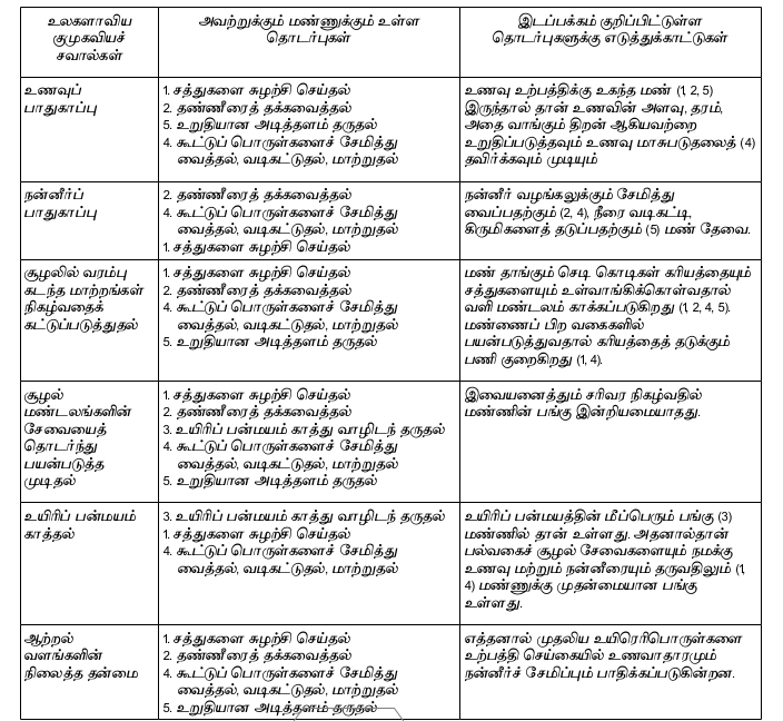 நிலம் தொடர்பான ஆய்வுரைகள், விவாதங்கள் ஆகியவற்றில் மண்ணுக்குத் தனி இடத்தை ஒதுக்கத் தவறுவதால் மண்ணின் மேற்கண்ட ஐவகைப் பயன்களைக் குறித்தும் நாம் எண்ணத் தவறிவிடுகிறோம். மண் வளம் குன்றுவதால் நிலைத்த மேம்பாடு எவ்வகைகளில் பாதிக்கப்படுகிறது என்பது குறித்த பார்வை நம்மிடையே இல்லை. உணவாதாரம், உயிரினப் பன்மயம், சூழல் மாற்றம், நன்னீர் நெறிப்படுத்தல் உள்ளிட்ட பல சிக்கல்களில் மண் வளத்துக்கு இன்றியமையாத பங்கு உள்ளது. ஆனால் இவற்றுடன் மண் வளத்துக்கு உள்ள இணைப்பைக் குறித்த புரிதலை விளக்குவதற்கு இதுகாறும் எளிமையான வழியொன்றும் கண்டுபிடிக்கப்படவில்லை.