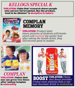 - பூஸ்ட் – இந்தப் பானத்தை பருகினால், குழந்தைகளுக்கு 3 மடங்கு அதிக சக்தி உருவாகும் என்று தவறுதலாக எண்ணவைக்கும் விதத்தில் இதன் அட்டை சித்திரத்தில் எழுதப்பட்டுள்ளது. இதுபோல் இன்னமும் பல பொருட்கள் விளம்பரதாரர்களால் தவறுதலாகவும், மிகைப்படுத்தியும், வேண்டுமென்றே திசைதிருப்புவதாகவும் அமைந்துள்ளது.